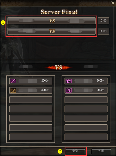 - 選擇想要觀戰的比賽(①)後,點擊下方“查看”(②)時,將以觀戰視角進入賽場。