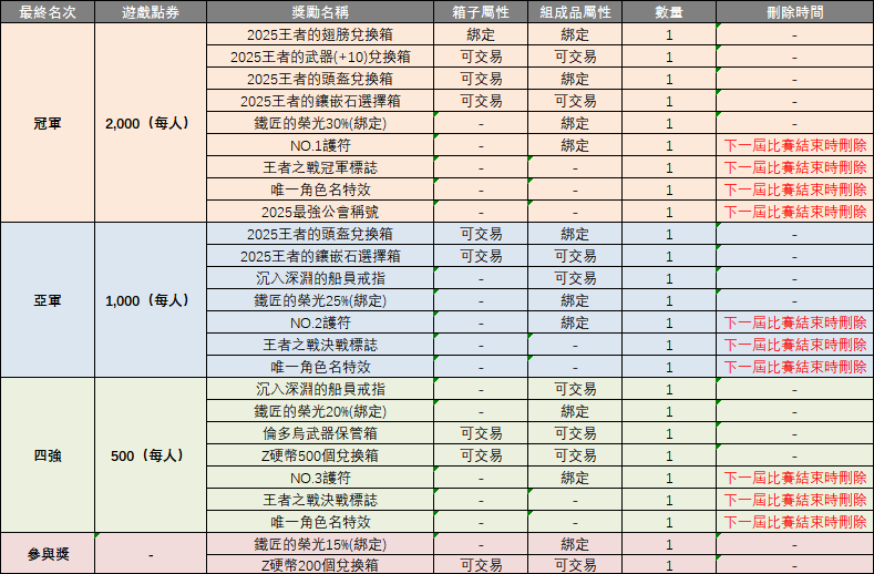 - 2025王者之戰【期限獎勵發放】:(11月26日已完成)