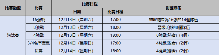 ※ 主辦方抽取:12月4日晚 (由於對戰表為隨機抽取,因此可能會有相同伺服器隊伍提前對戰)