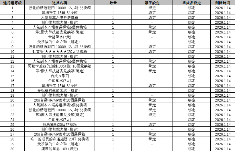 - 角色擁有<全能聖水(貴賓)>效果時,不僅可以領取[普通通行證獎勵],還將也鎖對應等級的[高級通行證獎勵]。