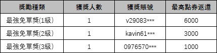 例:“最強免單獎(1級)”獲獎賬號B在指定時間內消耗了8000遊戲點券,此時賬號B將在後續獲得6000遊戲點券。
