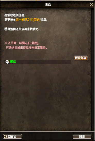 ※ 任務完成後獲得的‘第N顆時間之石 [完成]’為限時物品,自獲得起僅存在10分鐘,必須在此時間內接取後續任務,否則任務進度將中斷。