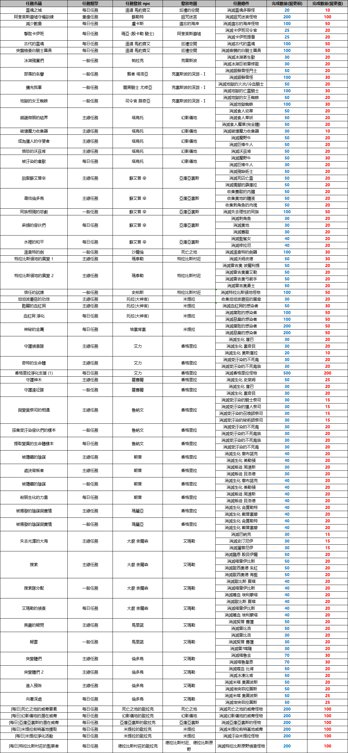 - 為了任務能夠更順利地進行,下述任務的完成條件將下調。