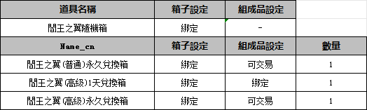 - 可通過修羅島NPC:祖魯(獵人),消耗“閻王之翼製作材料”兌換[閻王之翼隨機箱子]。