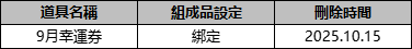 ※ 《9月幸運券 30個兌換箱子》的刪除時間為“2025.10.15維護期間”。