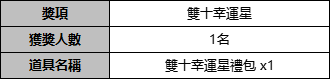 - 【雙十幸運星】可从【雙十幸運星兌換箱】組成品中獲得。