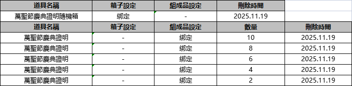 - 以2025年11月12日維護時為准,將統計全體伺服器角色背包中的<萬聖節慶典證明>持有數。