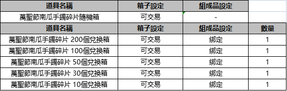- 通過戰地河谷NPC:傑克,消耗<萬聖節南瓜手鐲碎片>可兌換隨機箱子