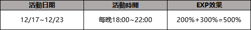 - 12月17日~12月23日期間,每晚18:00 ~ 23:00共用300%經驗值。