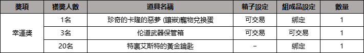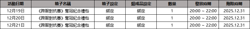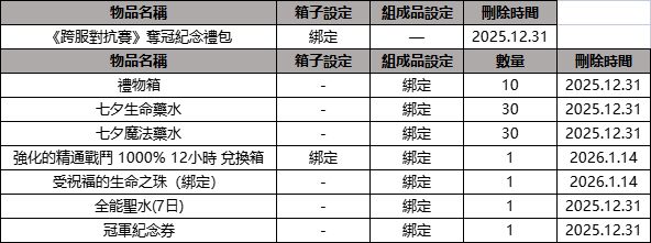 - 以2025年12月24日維護時為准,將統計全體伺服器角色的《冠軍紀念券》持有數進行幸運獎的隨機抽取。