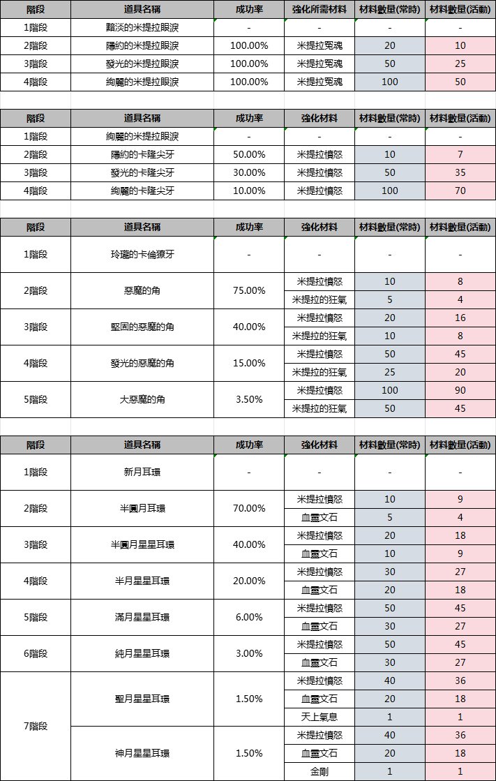 - 升階失敗時僅消耗強化材料,不會降低飾品階段。