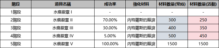 - 升階失敗時僅消耗強化材料,不會降低徽章階段。