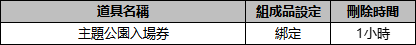 - 入場券為期限道具,獲得後一小時內未使用將會自動消失。