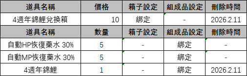 ※ 【4週年錦鯉兌換箱】出售截止時間為2026年1月27日24:00。(售價10點券)