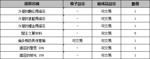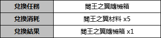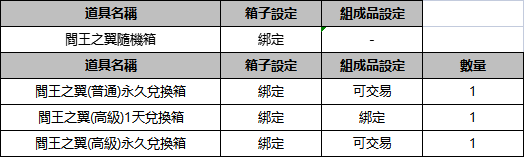 - 可通過修羅島NPC:祖魯(獵人),消耗“閻王之翼製作材料”兌換[閻王之翼隨機箱子]。