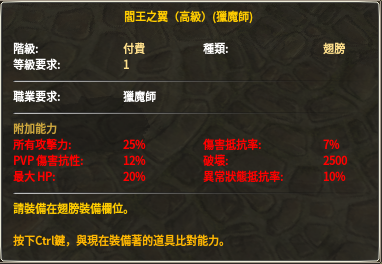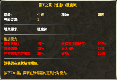- 可通過修羅島NPC:祖魯,對閻王之翼進行升階強化。
