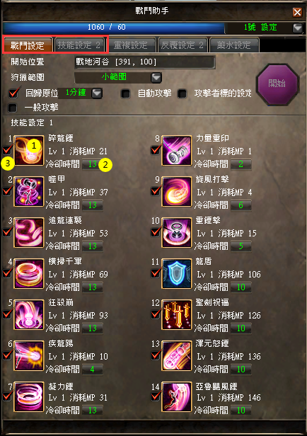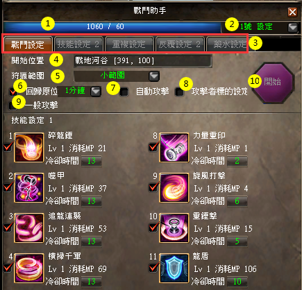 - 打開戰鬥助手介面後,可設置戰鬥助手相關功能。