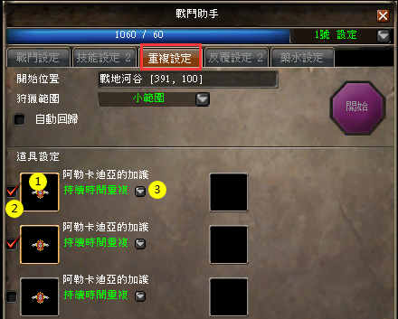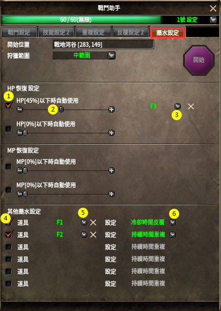 ※ 相較於“遊戲設置- >戰鬥設置”中的藥水自動使用設置,戰鬥助手中的“藥水設定”菜單,可設置非自動藥水的使用。