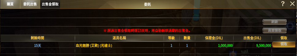 - 領取:點擊可領取完成道具出售而獲得的出售金與保證金。