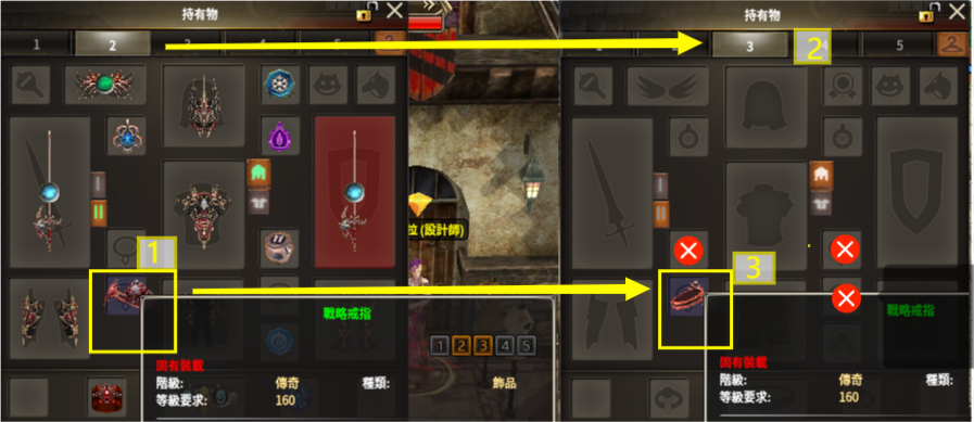 例:將2號【裝備預設頁】中左下角飾品槽中的裝備,穿戴至3號【裝備預設頁】時,只能穿戴至相同的左下角飾品槽中。