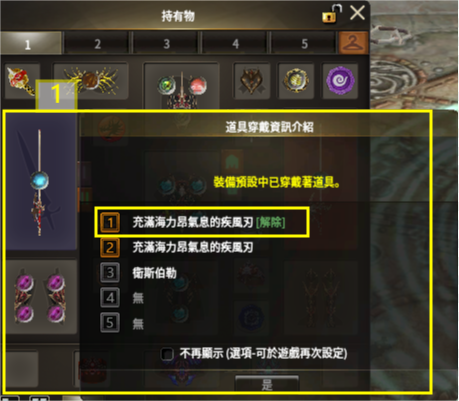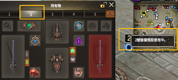 - 角色可使用“1-5號”【裝備預設頁】。(即最多可保存5套裝備組合)