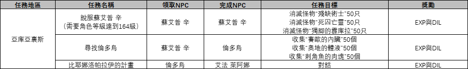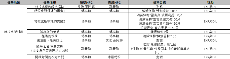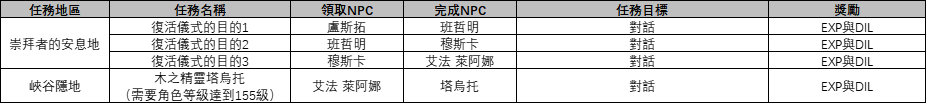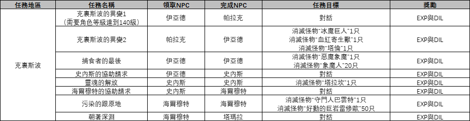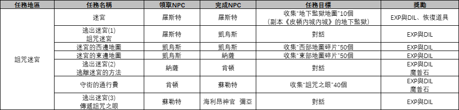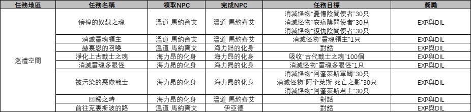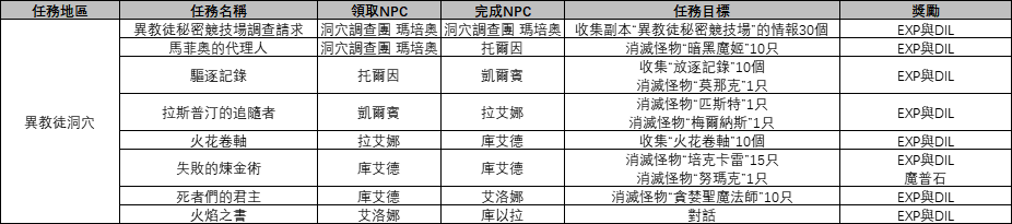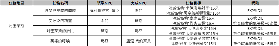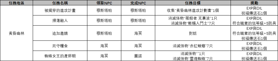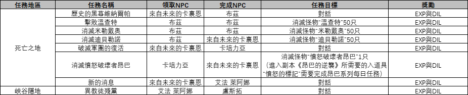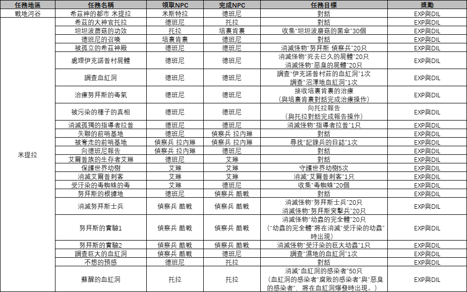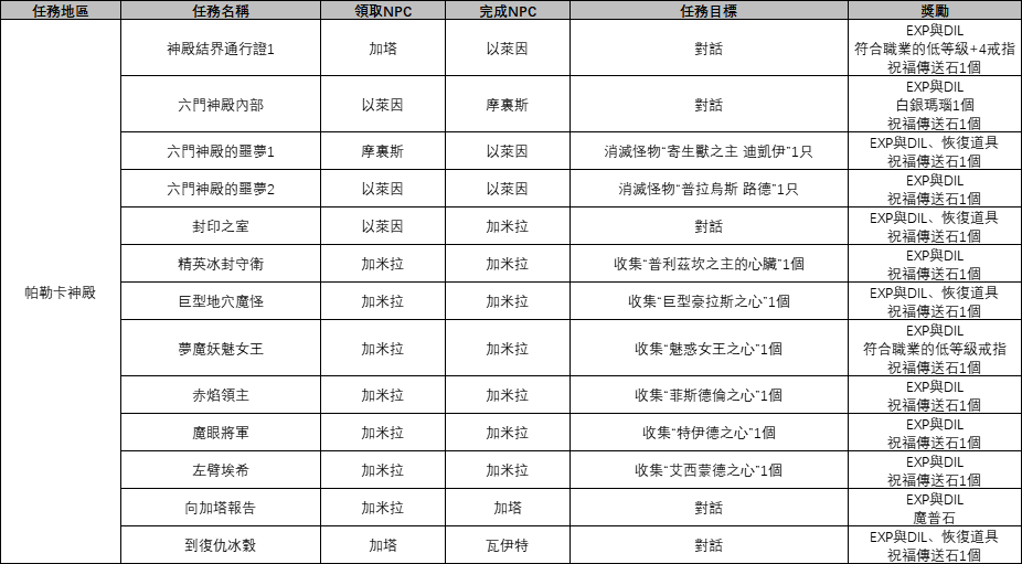 任務 主綫任務 ■ 戰地河谷 ■ 黃昏幽林 ■ 寒風雪原 ■ 帕勒卡神殿 ■ 復仇冰穀 ■ 異教徒洞穴 ■ 赤龍沙漠 ■ 遺忘海岸 ■ 亞法隆島 ■ 皮頓內城 ■ 詛咒迷宮 ■ 阿奎萊斯 ■ 巡禮空間 ■ 克裏斯波 ■ 克裏斯波的深淵 ■ 死亡之地 ■ 昂巴系列每日任務 ■ 崇拜者的安息地 ■ 幻影儀地 ■ 亞庫亞裏斯 ■ 特拉比斯村莊 ■ 米提拉 ■ 香格里拉 ■ 艾瑪勒 ※ 以上內容僅供參考。