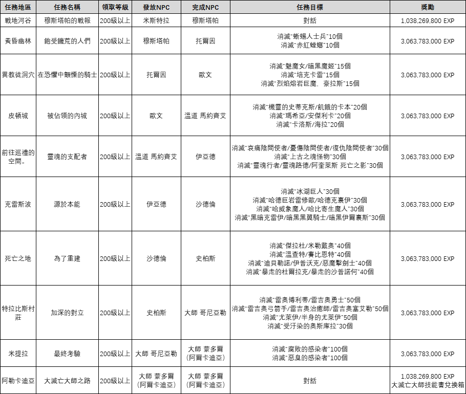 任務 大師任務 一、大師任務: ※ “資格的證物”可通過消滅米提拉任意怪物獲得。 ※ “記憶的碎片”收集與消滅“伊尼可瑪”的目標,可在“塔薩阿卡多”副本中達成。 二、大滅亡大師任務: ※ “腐敗的感染者”與“惡臭的感染者”將在米提拉血紅洞暴走時出現。 ※ 消滅米提拉怪物2萬只時,將會開啟地圖活動血紅洞的暴走。 ※ 以上內容僅供參考。
