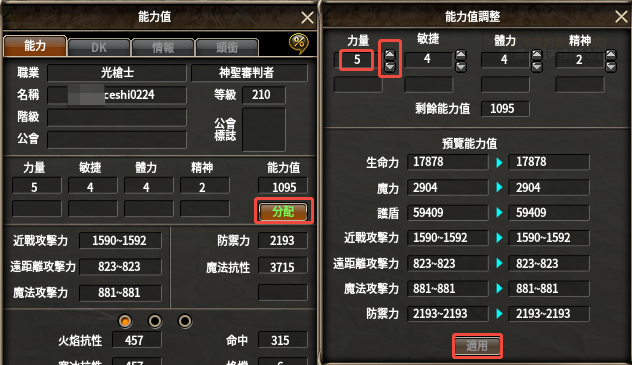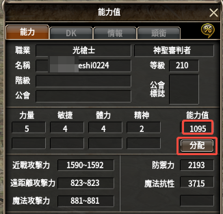 - 可通過角色資訊欄(快捷鍵[C])中的[分配]鍵,打開能力值分配介面。