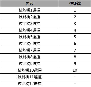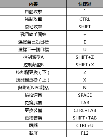 新手指南 快捷鍵使用 一、查看資訊窗口 二、角色主要動作 三、角色輔助動作 四、召喚獸命令 五、技能欄 六、藥水欄 ※ 以上為遊戲默認快捷鍵,玩家更改快捷鍵時將適用更改後的快捷鍵。 ※ 遊戲快捷鍵可通過“ 選項(ESC) -> 遊戲設定 -> 變更快捷鍵”來進行。 ※ 以上內容僅供參考。