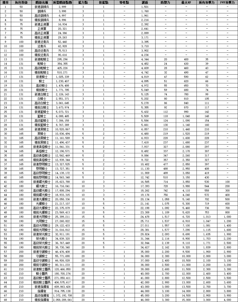 - 根據等級提升顯示的[護盾/防禦力/HP上限/所有攻擊力/PVP攻擊力]是累計給出的數值,實際上升的數值請參考表格。