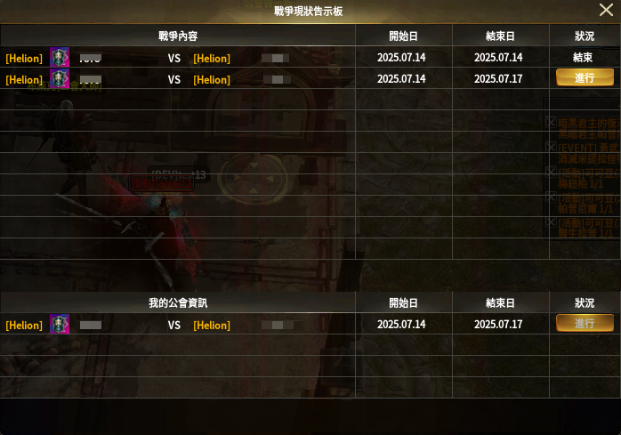 1. 可通過 [公會(G) -> 戰爭現狀]中,查看公會戰爭相關狀態與記錄。