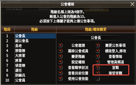 1. 可通過 [公會(G) -> 權限 -> 權限設定 -> 選擇級別 -> 級別/權限變更] 設置公會戰爭相關權限。