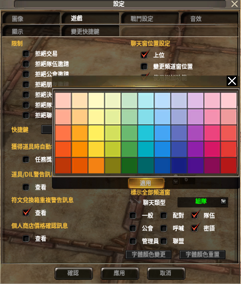 - 選擇想要更改的聊天類型後,在左下角的[字體顏色變更]專案中選擇想要的顏色後點擊“應用”按鈕即可。