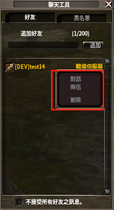 ※ 在列表內右擊好友名稱可進行“對話/組隊/刪除”等操作。