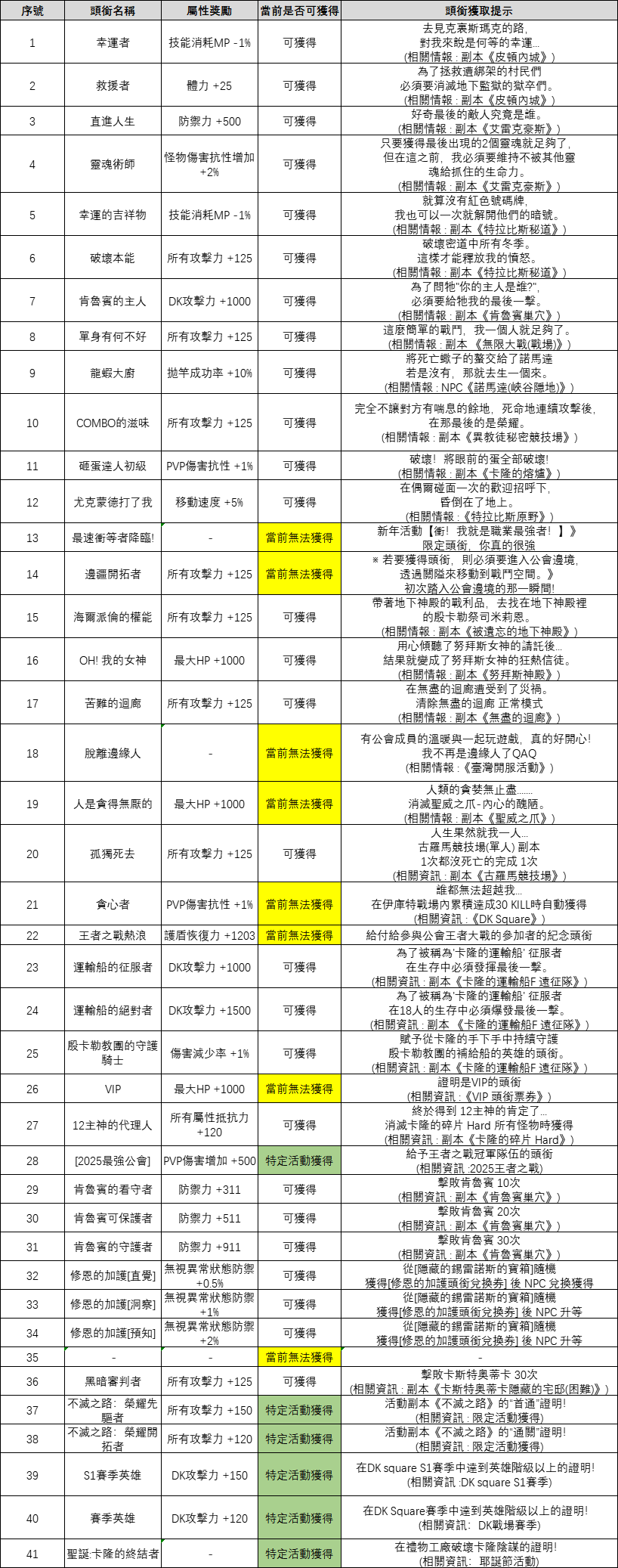 遊戲系統 頭銜系統 一、頭銜介紹 1.遊戲內通過達成特定條件即可獲得頭銜。 2.頭銜可為角色附加額外屬性。 3.角色可選擇頭銜進行佩戴。(角色資訊欄(快捷鍵:C) -> 頭銜) 二、頭銜列表 ※ 以上內容僅供參考。