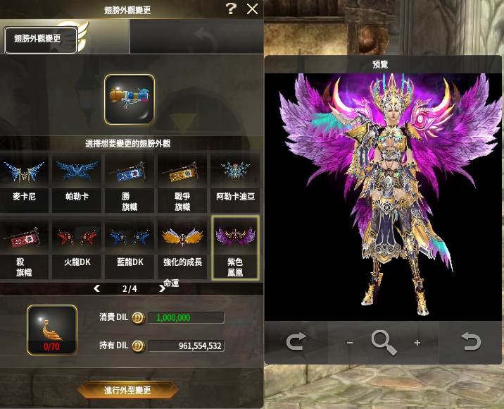 - 每次【翅膀外觀變更】需要消耗【自由的結晶70個】與【100萬DIL】。