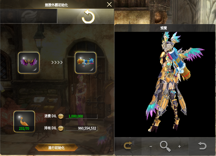 - 每次翅膀外觀初始化需要消耗【自由的結晶70個】與【100萬DIL】。