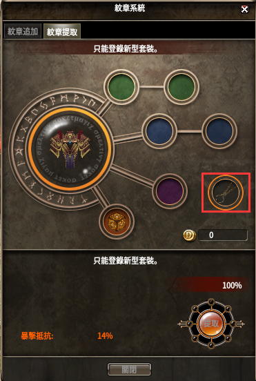 - 提取成功 : 套裝中的對應紋章孔變為空的狀態,且獲得提取的紋章。