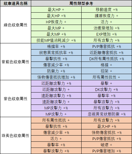 - 紋章道具分為4種,根據紋章的種類(顏色),賦予的屬性與數值並不相同。(綠色 < 紫藍色 < 紫色 < 珠黃色)