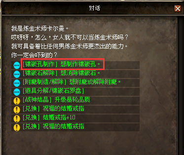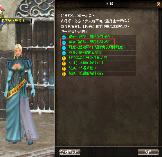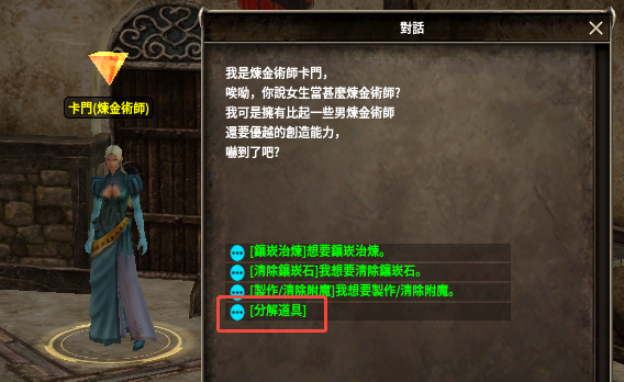 2.為了進行鑲嵌石的移除,需要與戰地河谷煉金術士NPC:卡門對話,選擇“[鑲嵌石解除]想消除鑲嵌石”功能。
