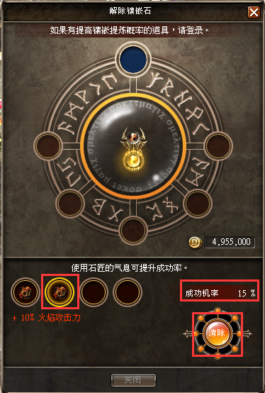- 鑲嵌解除的成功率與費用會隨著裝備的等級和種類(一般、魔幻、高貴、神聖、傳奇)而有所不同。